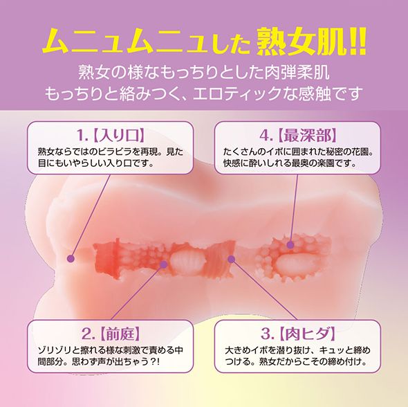 内部は大小のイボが連なり、上下左右から刺激を与える形状。じんわりと優しく包み込む様な感触がお楽しみいただけます。熟れた肌が絡みつく、いやらしい使用感の熟女ホール。経験豊富な熟れた果実をご堪能ください。